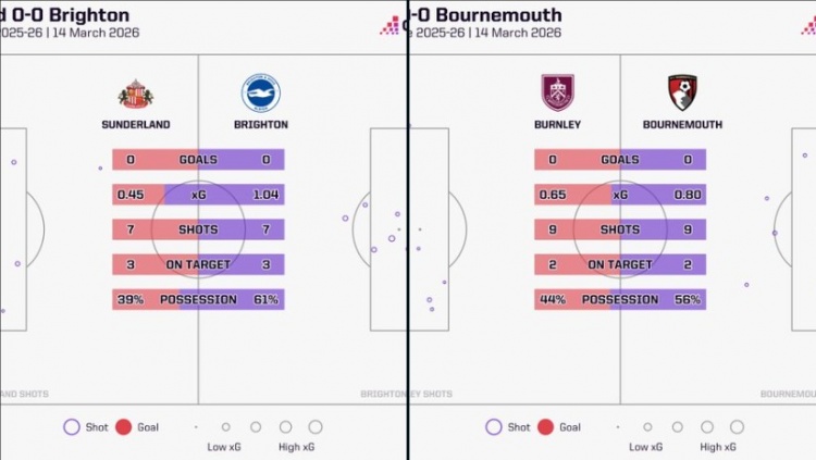 3月14日讯 目前两场英超职业联赛 正在进行中,桑德兰半场0-0战平布莱顿、伯恩利半场0-0战平伯恩茅斯,但这两场的攻击 数据非常亮眼。