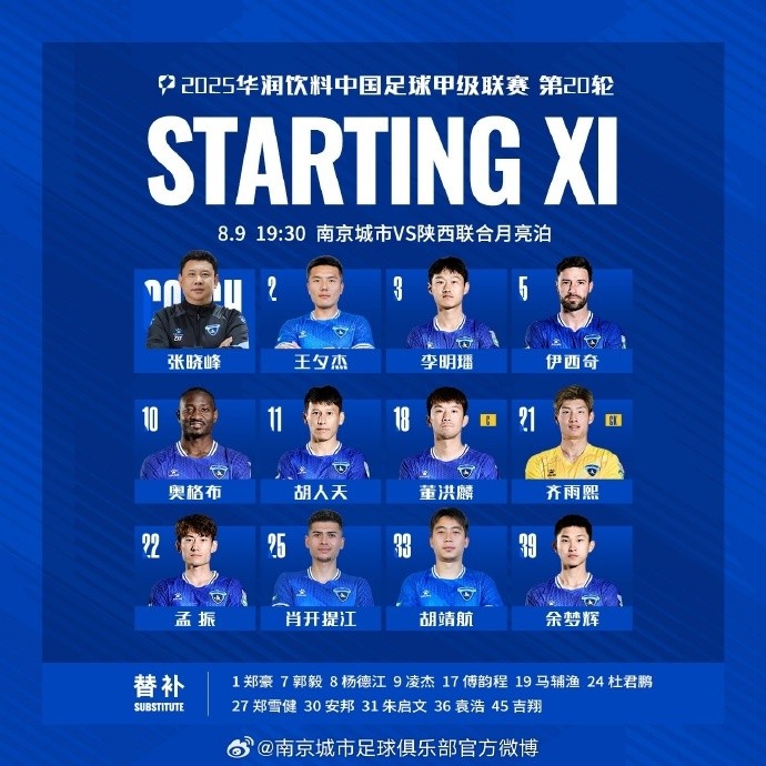 中甲联赛第20轮,南京城市VS陕西王人集月亮泊 首发名单出炉,让咱们并肩作战!