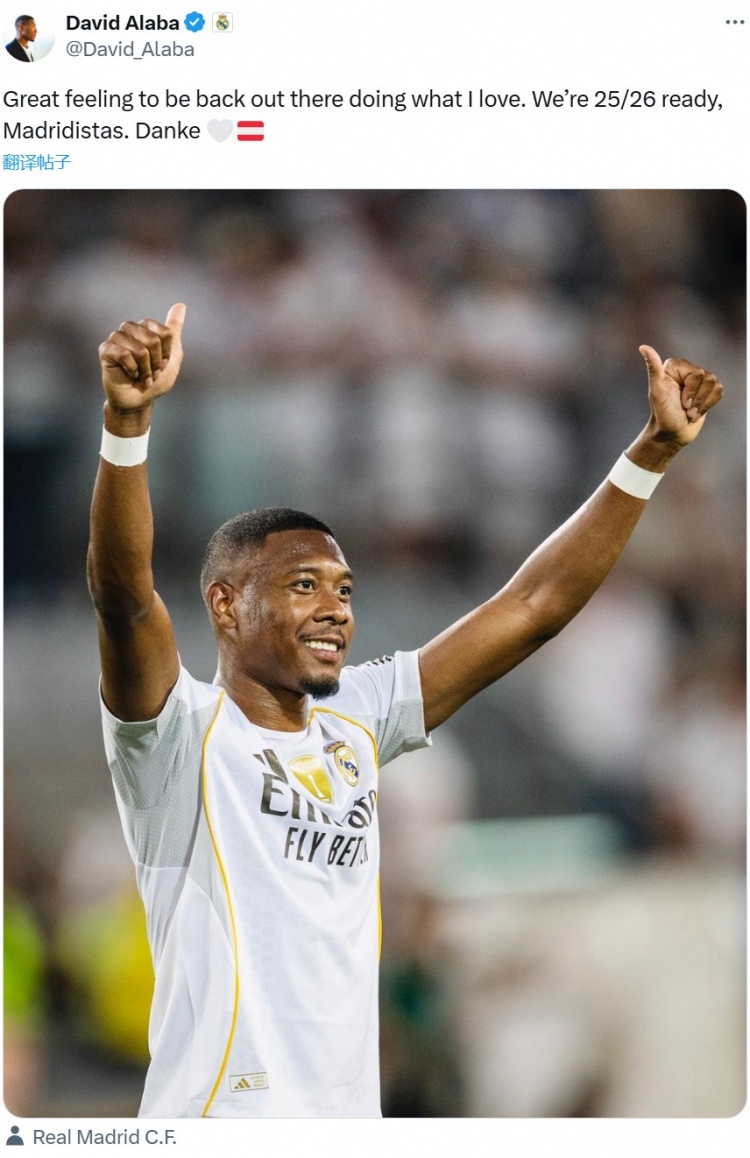 阿拉巴晒出我方像片,并配文写谈:“能重返赛场作念我方深爱的事情,嗅觉止境棒。咱们依然为25-26赛季作念好准备,感谢马德里球迷们。”