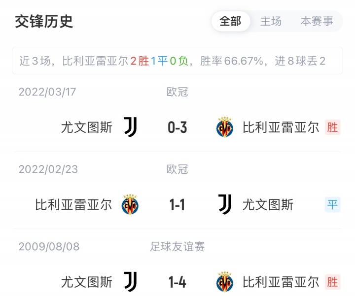 尤文欧冠2次对阵比利亚雷亚尔均不堪(1平1负)。