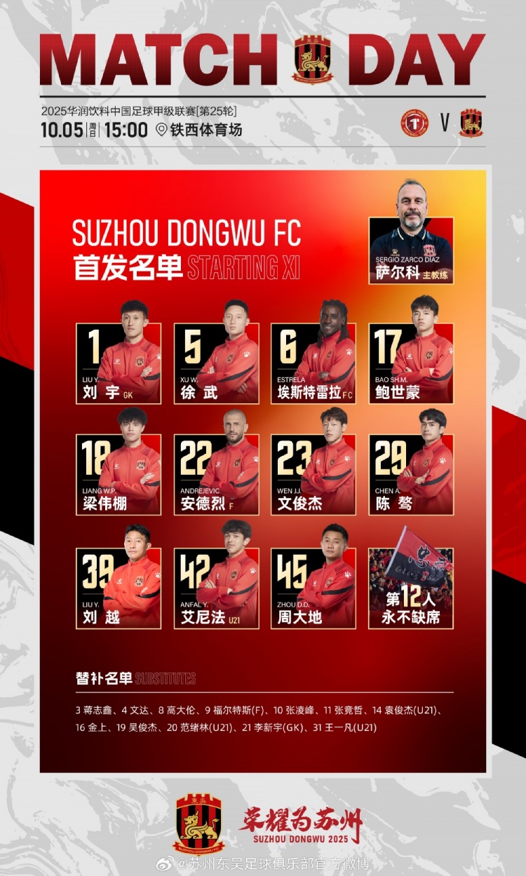 中甲联赛第25轮:辽宁铁东谈主vs苏州东吴,首发名单