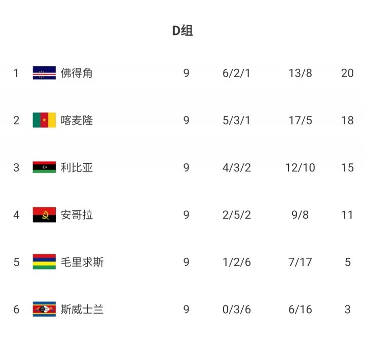 世初赛仅剩终末一轮,佛得角仍2分领跑,下轮濒临小组垫底的斯威士兰,赢球即可确保队史初度晋级世界杯;喀麦隆第2落伍2分,但抓有7个净胜球上风。