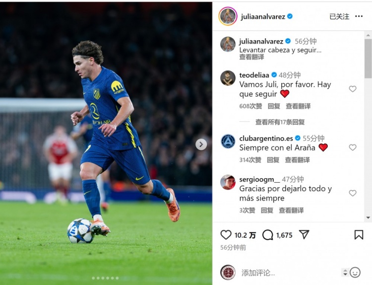 马竞时尚阿尔瓦雷斯此役踢满全场,赛后他在应答媒体上晒出比赛像片,配文:“抬发轫,持续前进。”