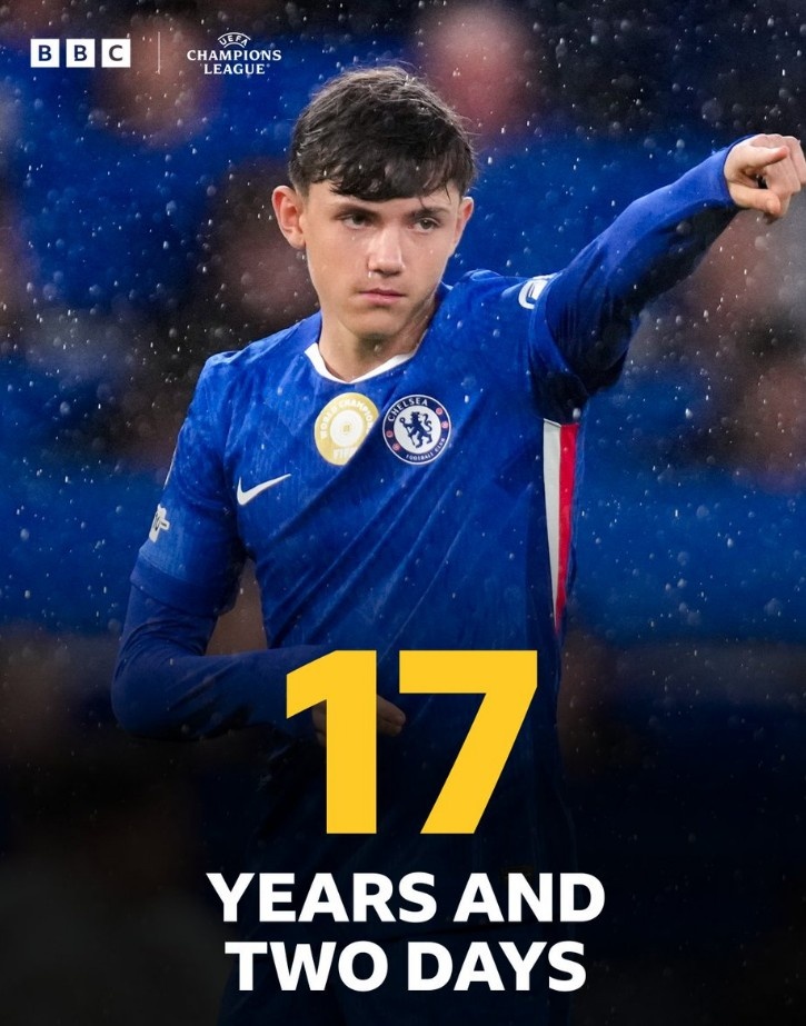 据统计,17岁的沃尔什创造了蓝队列史最年青欧冠登场记录。