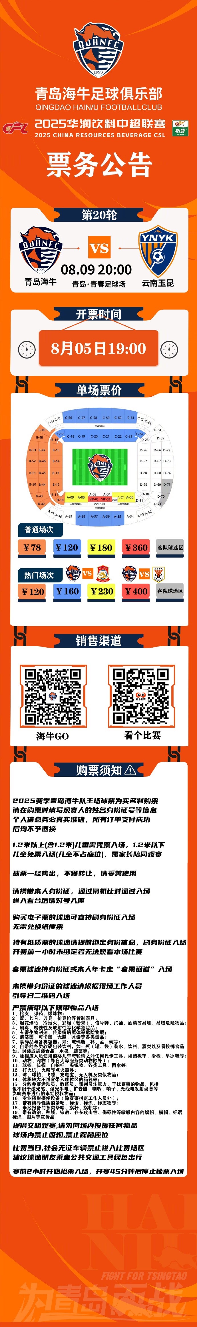 2025中超联赛第20轮青岛海牛vs云南玉昆票务公告