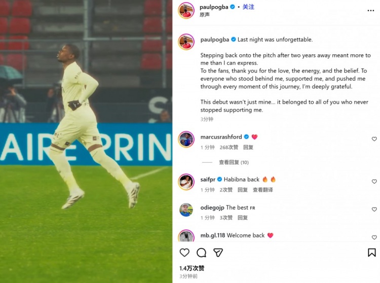 博格巴社媒:时隔2年重返球场对我赞佩赞佩超卓 感谢一直撑捏我的东说念主们