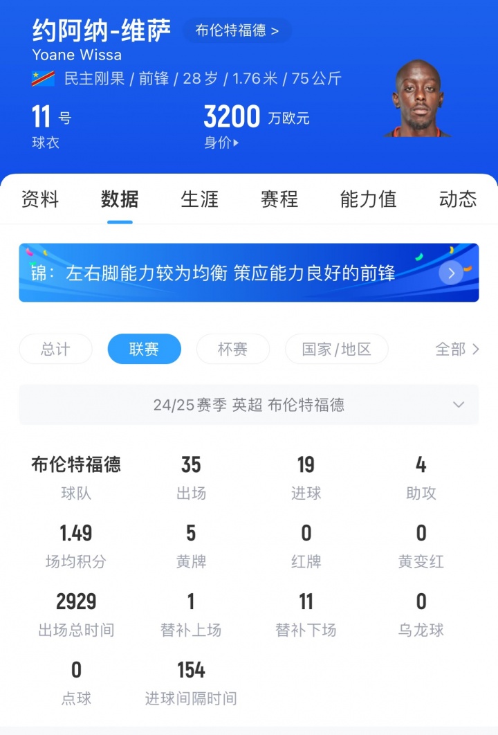 28岁的维萨还有1年公约,球员24-25赛季39场20球4助攻,德回身价3200万欧。