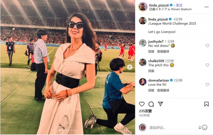 琳达来到日本,现场不雅看利物浦对阵横滨水手的热身赛(J联赛天下挑战赛),她在酬酢媒体上晒出像片,配文:“2025年J联赛天下挑战赛,加油利物浦。”