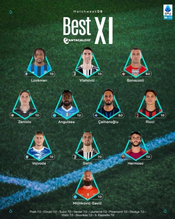 意甲第9轮最好阵:DV9、恰20入选,加蒂、扎尼奥洛、里奇在列