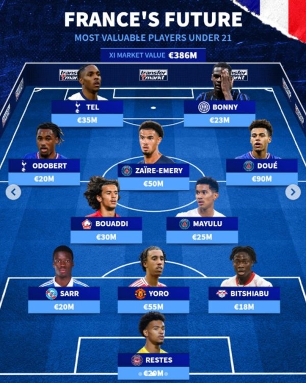 法国U21最贵阵:杜埃9000万欧领衔,约罗、博尼、特尔在列