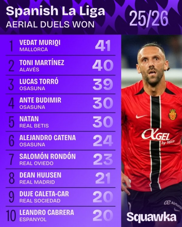 10月7日讯 日前,Squawka统计了本赛季西甲争顶告捷次数排名,赫伊森21次位居第八。 1、维达特-穆里奇(马洛卡):41次 2、托尼-马丁内斯(阿拉维斯):40次 3、卢卡斯-托罗(奥萨苏纳):39次 4、布迪米尔(奥萨苏纳):30次 5、纳坦(贝蒂斯):30次 6、卡特纳(奥萨苏纳):24次 7、龙东(皇家奥维耶多):23次 8、赫伊森(皇马):21次 9、卡莱塔-卡尔(皇家社会):20次 10、卡夫雷拉(西班经纪东说念主):20次......查看更多