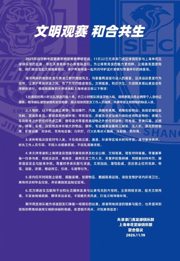 2025华润饮料中超联赛行将迎来赛季收官战,11月22日天津津门虎足球俱乐部与上海申花足球俱乐部的比赛,将在天津奥体中心领略场进行。为让体育竞技的魔力更贞洁,让不雅赛氛围更谐和,咱们趋奉发起文静不雅赛倡议,津沪两地球迷一王人共同看管这片样貌与尊重并存的绿茵场。......查看更多