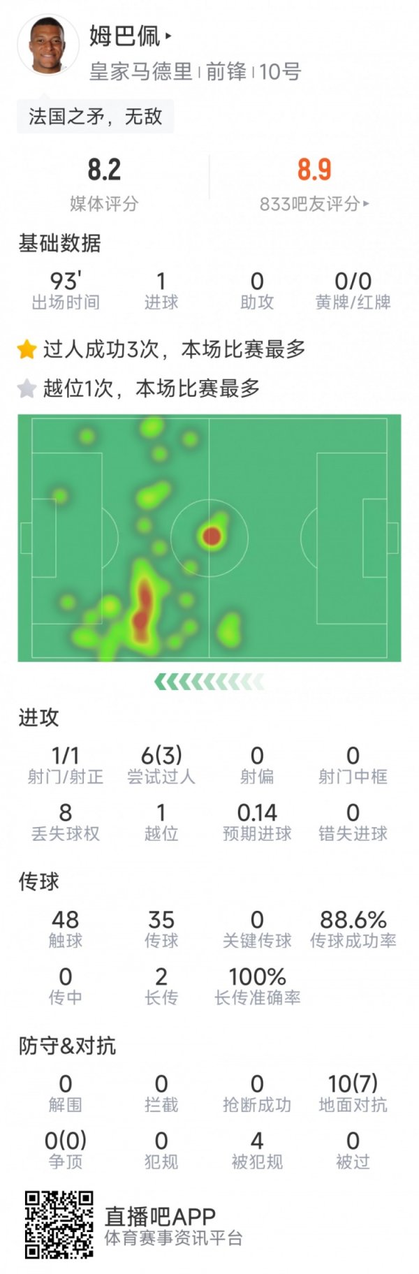 姆巴佩本场数据:1粒进球,仅1次射门,3次到手过东谈主,11抵挡8到手