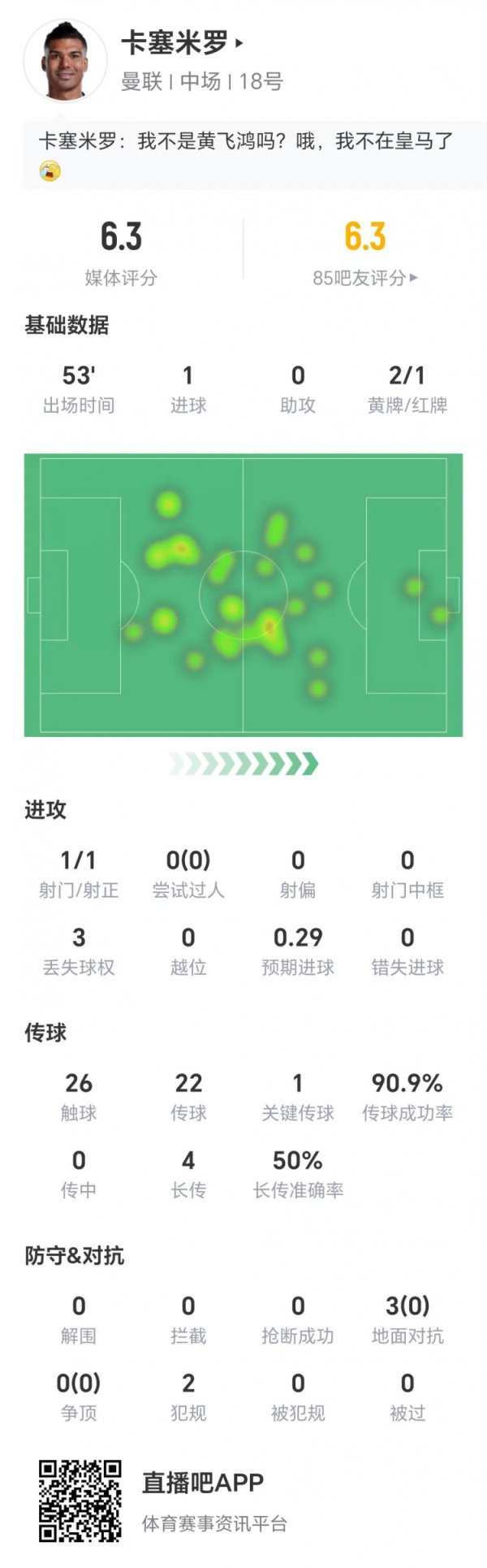 两黄变一红被罚下,卡塞米罗数据:1射1正进1球,1次要道传球
