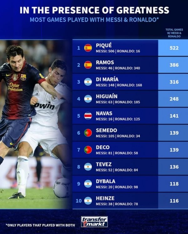德转列同梅罗同事最多场次榜:皮克、拉莫斯、迪马利亚分列前三
