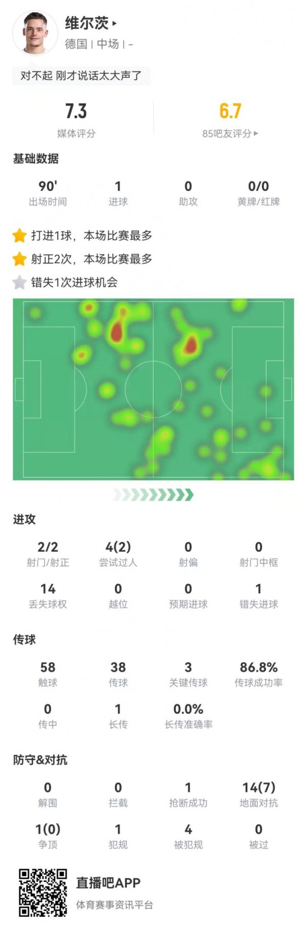维尔茨本场2射2正进1球+1失良机 3关键传球4造犯规+15回击7告捷