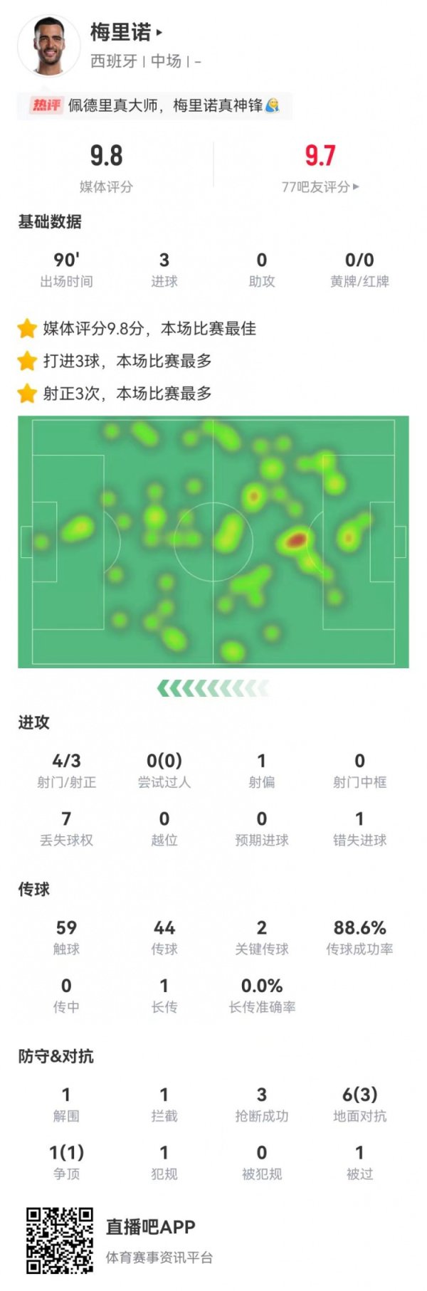 梅里诺4射3正进3球1失良机 1造良机2要津传球 2封堵3抢断 获9.8分