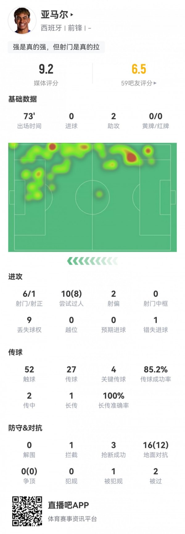 个东说念主秀场!亚马尔数据:2次助攻8次过东说念主12次告成回击,评分9.2