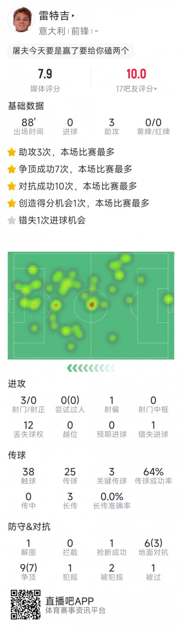 病笃中枢!雷特吉本场数据:3次助攻,3射0正,3次关节传球