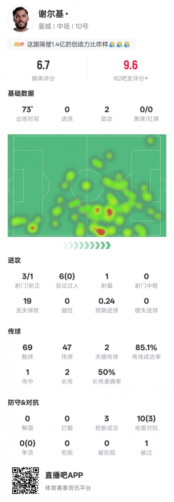 11月3日讯 2025-26赛季英超第10轮,曼城主场迎战伯恩茅斯。谢尔基首发出战,送出2次助攻,2次要津传球,还有3次抢断,评分6.7。 谢尔基本场比赛具体数据如下: 进球0 助攻2 射门3 射正1 过东谈主6 过东谈主收效0 射偏1 丢失球权19 触球69 传球47 要津传球2 传球收效劳85.1% 传中1 长传2 长传准确率50% 抢断3 大地挣扎10 大地挣扎收效3 被过1......查看更多
