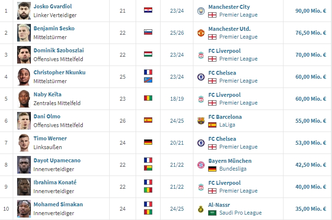 据德转统计,塞斯科的转会将成为莱比锡红牛队史出售球员金额的第二位,其中前五名球员均赶赴英超,前10中英超买东说念主也占据7席。