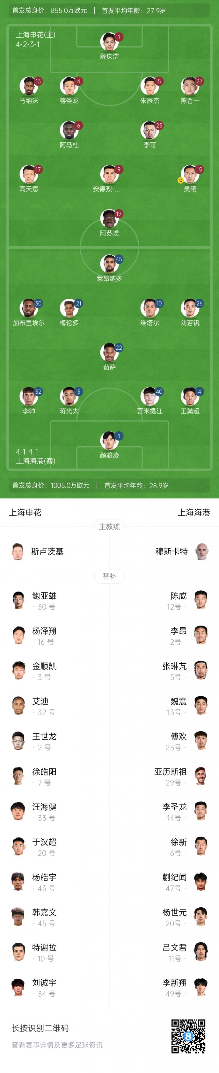 上海申花首发:1-薛庆浩、4-蒋圣龙、5-朱辰杰、13-马纳法(F)、27-陈晋一、6-阿马杜(F)、15-吴曦、17-高天意、23-李可、9-安德烈-路易斯(F)、19-阿苏埃(F)
