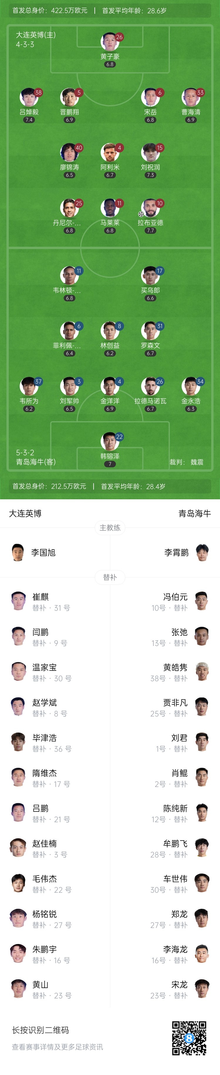 第31分钟,吕焯毅禁区角隔邻送出一记绝妙曲线,皮球绕事后卫,拉布亚德铲射破门!大连英博1-0卓著青岛海牛↓