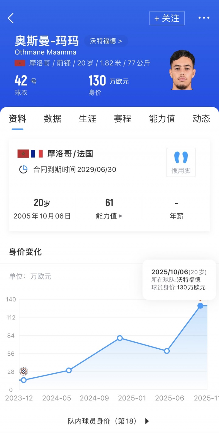 奥斯曼-玛玛当今身价130万欧。2024年提高至蒙彼利埃一线队,过问14场比赛,打进2球并有1次助攻。本年夏窗,沃特福德以130万欧的价钱签下了他,但球员尚未在英冠得到出场契机。