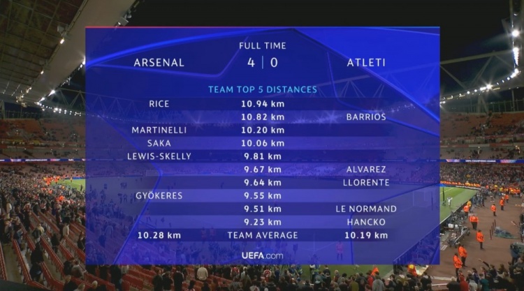 赛后两队跑动数据知道,阿森纳全队平均跑动距离为10.28KM略高于马竞的10.19KM。然而,在跑动距离最初10KM的球员中,阿森纳有3东说念主,区分为赖斯(全场最高10.94KM)、马丁内利和萨卡,而马竞仅有1东说念主为巴里奥斯。