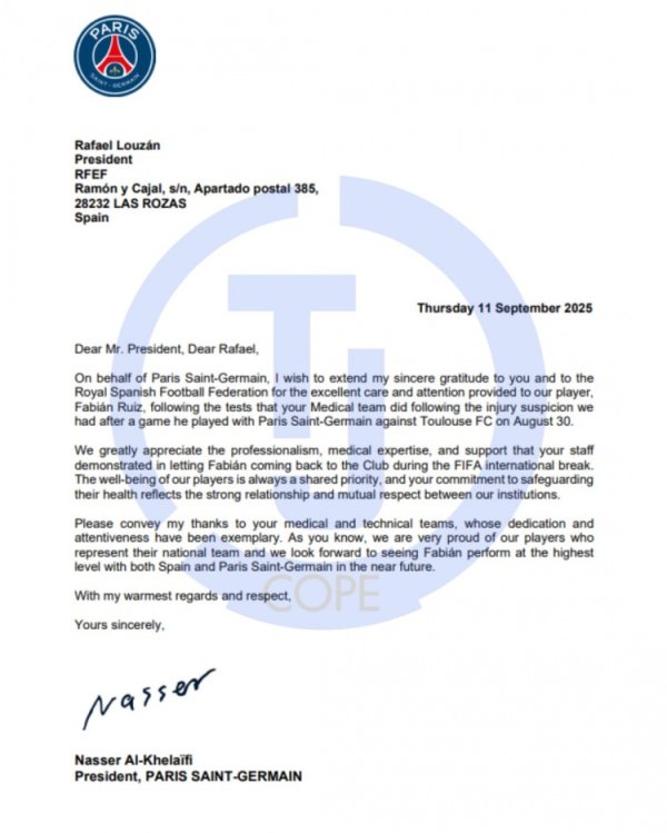 反不雅?巴黎主席纳赛尔致信西足协,感谢西班牙队放法比安提前归队