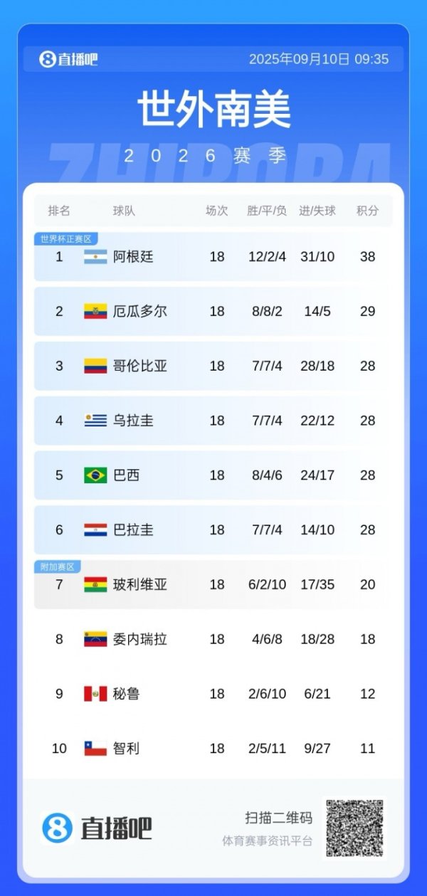 玻利维亚末轮胜巴西逆转进跨洲附加赛!委内瑞拉队史仍未进寰宇杯