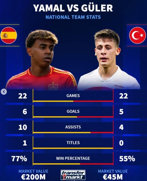 9月8日讯 土耳其行将迎战西班牙,两队的年青中枢恰恰来自皇马和巴萨。《转会市集》也对比了两东谈主的国度队关节数据。 亚马尔(西班牙,18岁,身价2亿,2023年国度队首秀):22场,6球10助攻,1冠军,胜率77% 居勒尔(土耳其,20岁,身价4500万,2022年国度队首秀):22场,5球4助攻,0冠军,胜率55%......查看更多