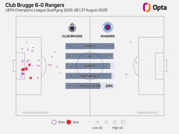 布鲁日6-0流浪者,是他们自2001年以来在欧战中最大比分的得手