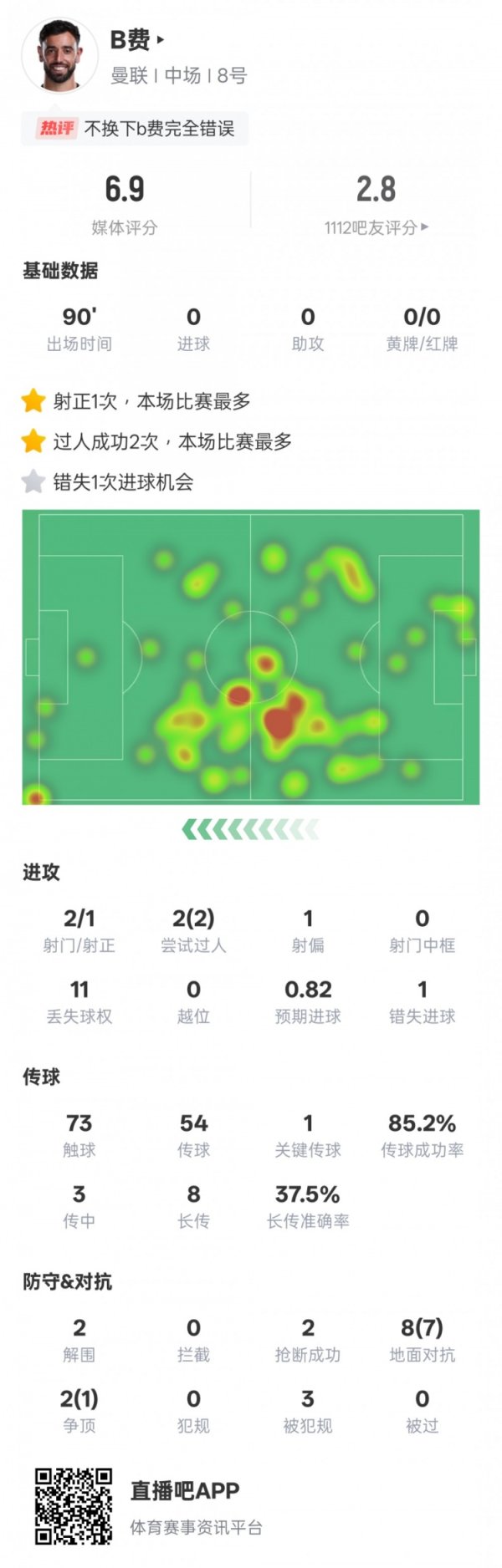 8月25日讯 2025-26赛季英超第2轮,曼联客场1-1富勒姆。B费首发出战,罚丢点球,另外他有2次过东谈主告捷和1次要津传球,评分6.9。 B费本场比赛具体数据如下: 进球0 助攻0 射门2 射正1 过东谈主2 过东谈主告捷2 射偏1 丢失球权11 错失进球契机1 触球73 传球54 要津传球1 传球告捷率85.2% 传中3 长传8 长传准确率37.5% 突围2 抢断2 大地造反8 大地造反告捷7 争顶2 争顶告捷1 被犯规3......查看更多