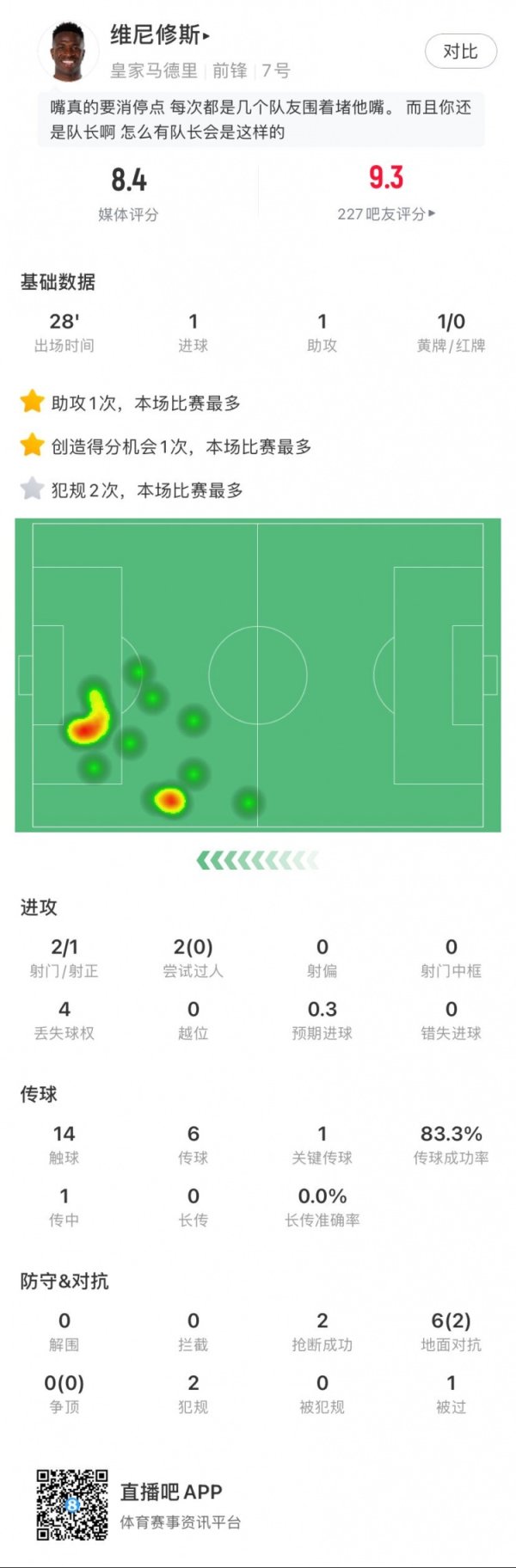 替补传射!维尼修斯全场数据:1进球1助攻,1次关键传球,评分8.4