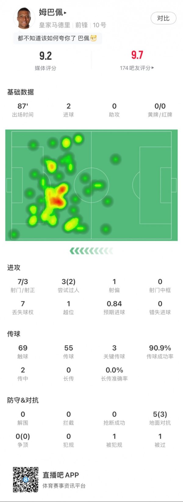 梅开二度!姆巴佩全场数据:2进球,7次射门3次射正,3次要道传球