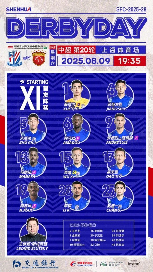 08月09日讯 北京工夫19:35,中超第20轮,上海申花主场迎战上海海港,赛前两边公布首发。 上海申花首发:1-薛庆浩、4-蒋圣龙、5-朱辰杰、13-马纳法(F)、27-陈晋一、6-阿马杜(F)、15-吴曦、17-高天意、23-李可、9-安德烈-路易斯(F)、19-阿苏埃(F) 上海申花替补:30-鲍亚雄、2-王世龙、3-金顺凯、7-徐皓阳、10-特谢拉(F)、16-杨泽翔、20-于汉超、32-艾迪、33-汪海健、34-刘诚宇、43-杨皓宇、45-韩嘉文 上海海港首发:1-......查看更多