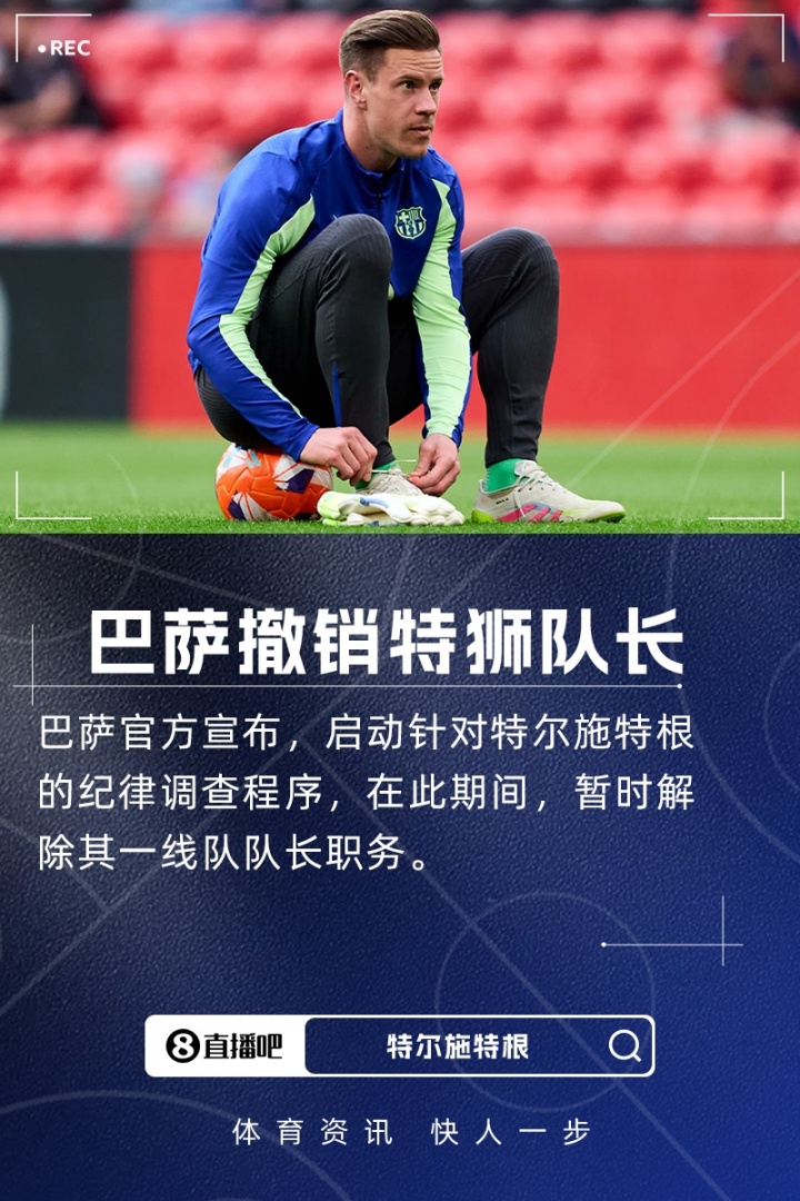 巴塞罗那足球俱乐部宣布,由于对球员特尔施特根启动的纪律调查程序,在该程序最终解决之前,俱乐部在与体育管理层和技术团队达成一致后,决定暂时撤销其一线队队长的职务。