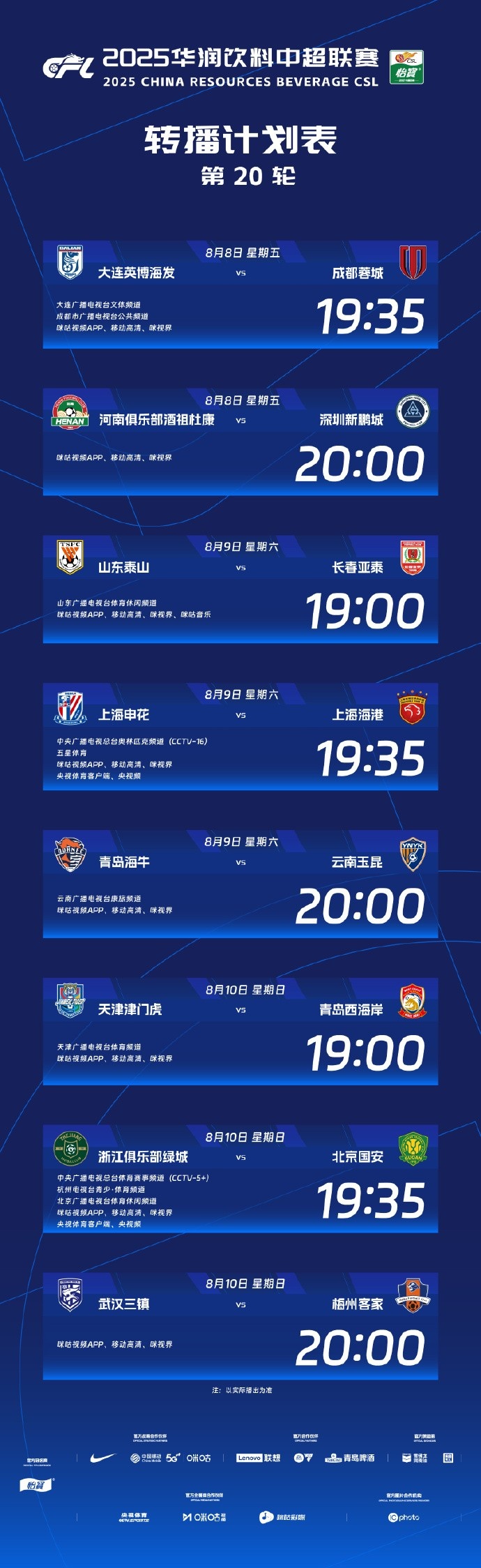 8月7日讯 根据中超联赛官方的消息,央视将对中超第20轮的上海德比、浙江vs国安这两场比赛进行直播。