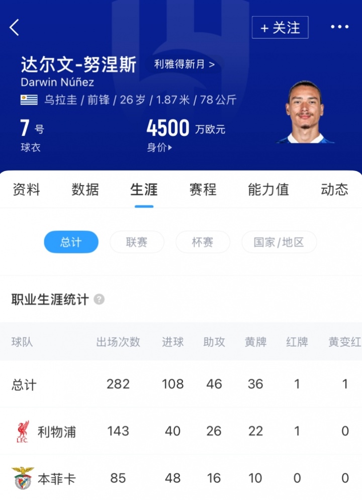 努涅斯自2022年从本菲卡转会以来,共为利物浦出场143次。上赛季他出战了30场联赛,但其中仅8次首发,并在球队赢得英超冠军的赛季中打入5球。努涅斯现年26岁,目前德转估值4500万欧。