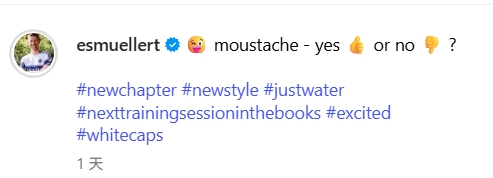08月10日讯 穆勒确定加盟温哥华白浪后,即将开启全新的生活。近日,穆勒在社媒上发布了一张留着小胡子的照片。