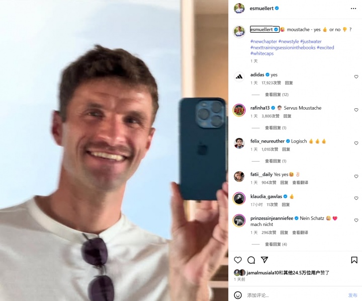 穆勒在社媒上发布了一张略显模糊的自拍照,脸上新留了胡子,笑容满面。他还直接问粉丝们要不要留胡子。