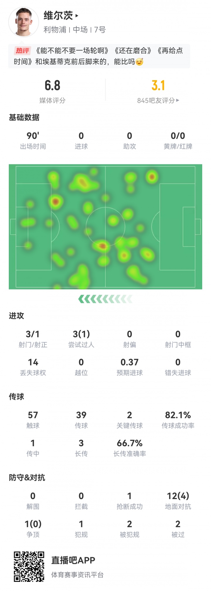 维尔茨未能展现出任何锐利度。这位德国国脚14次丢失球权,13次对抗仅赢下4次(成功率31%)。下半场一次传球失误后,他双手掩面——信心显然已遭受重挫。