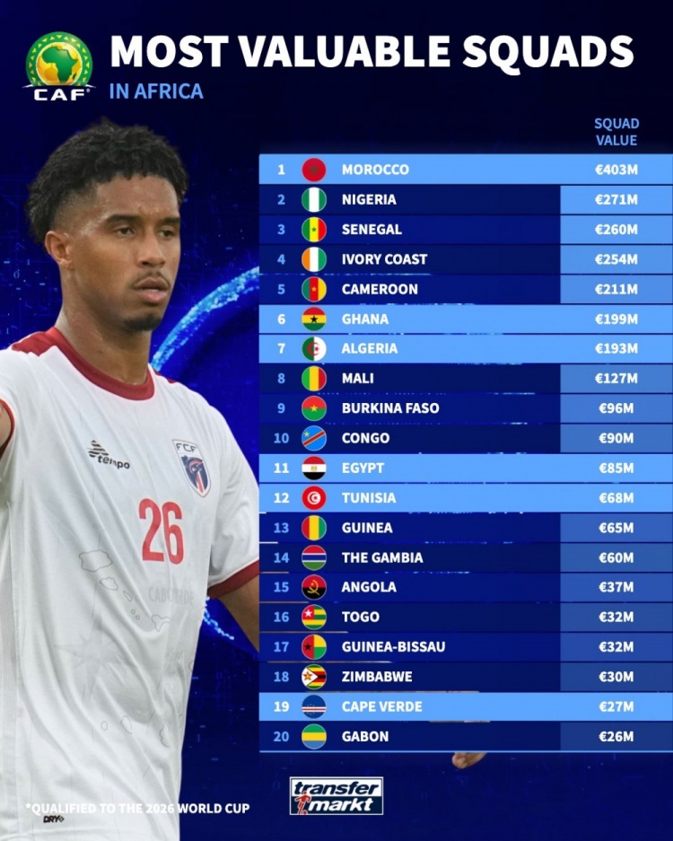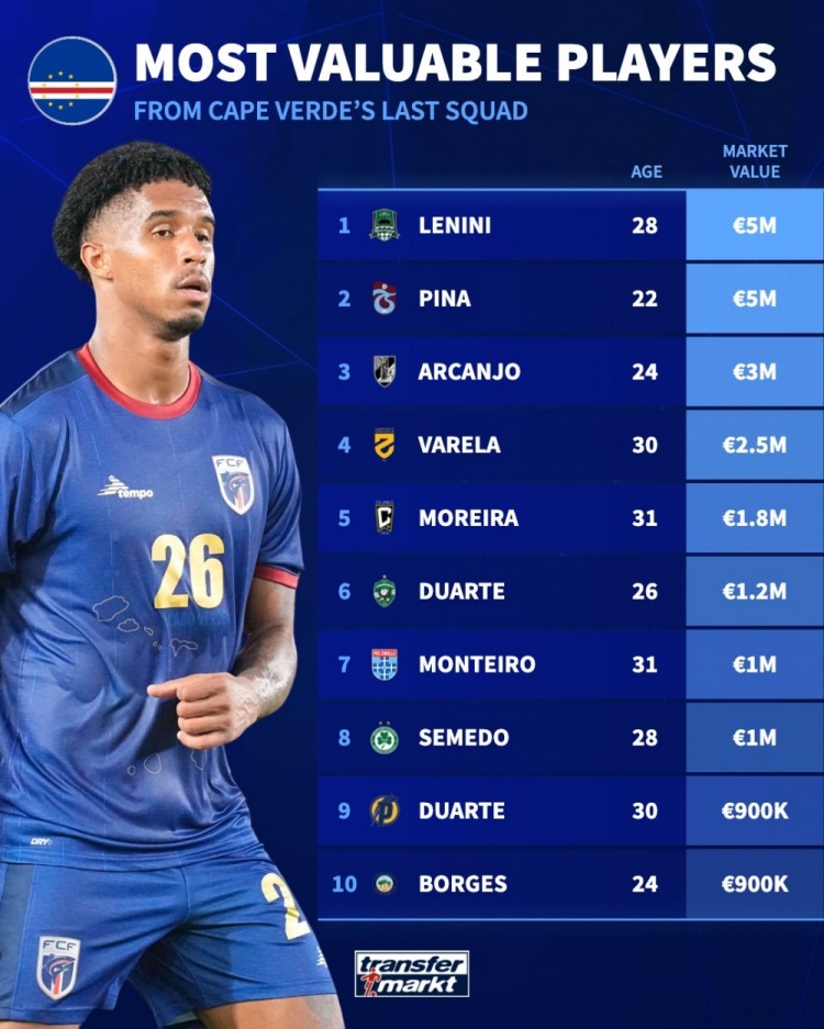 佛得角全队身价2720万欧,比国足(1263万欧)的两倍还多,但在非洲仅排在第19位。佛得角阵中身价最高的球员为效力俄超克拉斯诺达尔的凯文-皮纳和效力土超特拉布宗体育的瓦格纳-皮纳,两人身价均为500万欧元,全队8名球员身价超过100万欧。