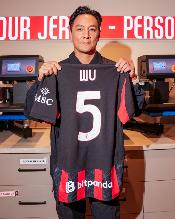 10月24日讯 AC米兰官博更新动态,晒出影星吴彦祖与米兰球衣的合照,球衣印号是5号的“WU”。