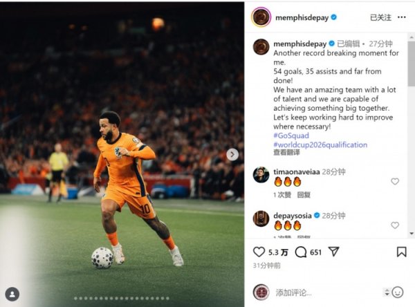 10月14日讯 世预赛欧洲区比赛,德佩1射2传,帮助荷兰主场4-0击败芬兰。 德佩为荷兰队打进54球,助攻35次,两项数据均位居荷兰队史榜首。 德佩社媒晒出比赛照片,并写道:“对我来说又是一个打破纪录的时刻。 54个进球,35次助攻,而且远未结束!” “我们拥有才华横溢的优秀团队,有能力携手共创辉煌。 让我们继续努力,在必要的方面不断进步。”......查看更多