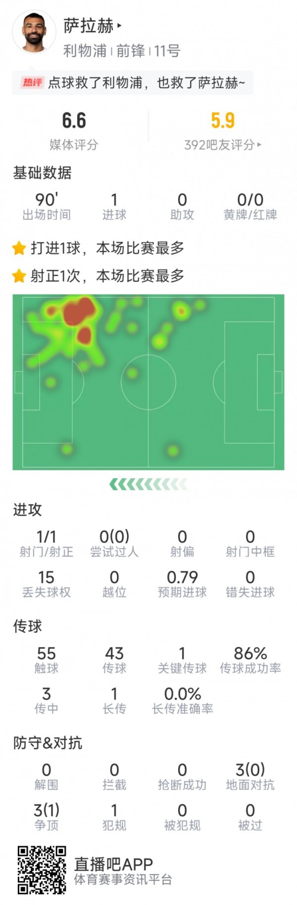 点球绝杀,萨拉赫本场数据:仅1次射门,6次对抗1次成功,0过人