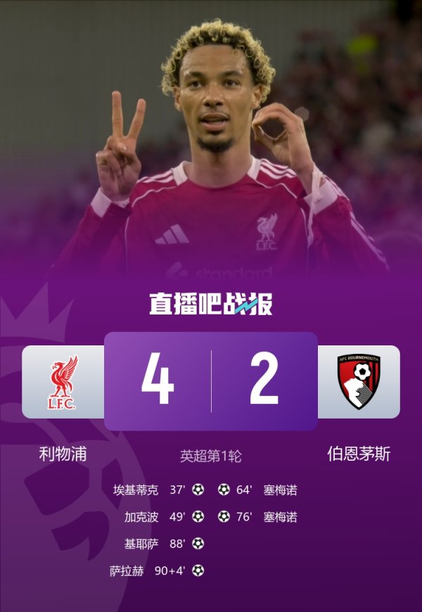 新赛季英超,利物浦开赛四轮比赛,3场绝杀(88分钟/100分钟/95分钟),1场83分钟神仙球制胜! 英超第1轮,利物浦4-2伯恩茅斯,基耶萨88分钟绝杀,萨拉赫94分钟锁定胜局! 英超第2轮,纽卡斯尔2-3利物浦!恩古莫哈100分钟绝杀! 英超第3轮,利物浦1-0阿森纳!索博斯洛伊83分钟任意球世界波制胜! 英超第4轮,伯恩利0-1利物浦!萨拉赫95分钟点球绝杀! 英超第一轮,利物浦4-2伯恩茅斯,基耶萨88分钟绝杀,萨拉赫94分钟锁定胜局! 英超第2轮,纽卡斯尔2-3利物......查看更多