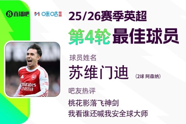 2025-2026赛季英超火热进行中,和咪咕体育联合发起每轮英超最佳球员评选活动!第四轮评选结果结出炉,苏维门迪头顶脚踢梅开二度,帮助阿森纳3-0大胜诺丁汉森林,获得吧友超14万票的支持,以绝对优势当选 【X咪咕体育英超第4轮最佳球员】! X咪咕体育|英超第4轮MVP评选 阿森纳3-0诺丁汉森林,苏维门迪头顶脚踢梅开二度! 吧友热评:桃花影落飞神剑,我看谁还喊我安全球大师......查看更多