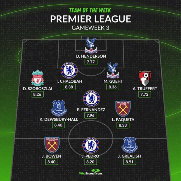 WhoScored英超第3轮最佳阵:索博、格拉利什、恩佐、格伊在列